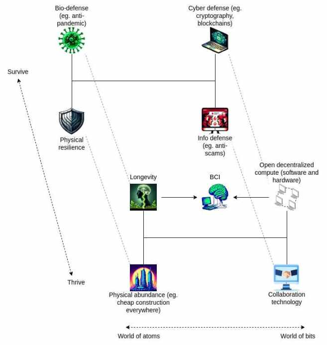 D/acc (Chủ nghĩa tăng tốc phòng thủ) là chiến lược bổ sung giúp phi tập trung an toàn hơn. Cốt lõi là phát triển công nghệ phòng thủ song song với công nghệ tấn công, và các biện pháp phòng thủ này phải mở và ai cũng tiếp cận được—giảm động cơ tập trung quyền lực vì lý do an ninh.