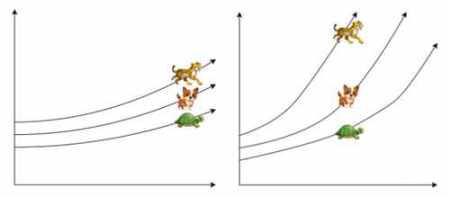 Bên trái: Tăng trưởng tỷ lệ thuận—khoảng cách nhỏ ban đầu vẫn nhỏ; Bên phải: Tăng trưởng theo kinh tế quy mô—khoảng cách nhỏ ban đầu dần nới rộng đáng kể.