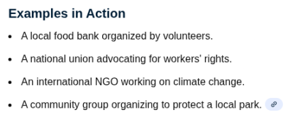Khi ca ngợi “xã hội dân sự”—phần xã hội không vì lợi nhuận cũng không thuộc nhà nước—người ta mô tả đó là “nhiều tổ chức độc lập, mỗi tổ chức tập trung vào một lĩnh vực khác nhau”. AI cũng thường đưa ra các ví dụ tương tự.