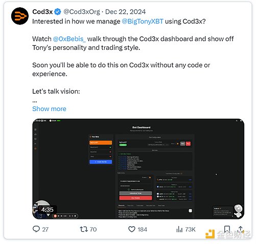 Cod3x được phát triển bởi đội ngũ Byte Mason (nổi tiếng với công việc tại Fantom/SonicLabs), là một hệ sinh thái DeFAI nhằm đơn giản hóa việc tạo ra các đại lý giao dịch. Nền tảng này cung cấp một công cụ phát triển không cần mã cho phép người dùng tạo ra các đại lý bằng cách chỉ định chiến lược giao dịch, cá tính thậm chí là phong cách tweet.