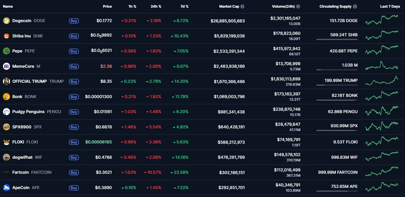 Top memecoin theo vốn hóa thị trường. Nguồn: CoinMarketCapBáo chí:YouTube cấm nội dung chơi game Web3, Animoca sẽ niêm yết trên Nasdaq: Web3 Gamer