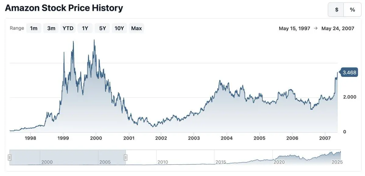 Ethereum vừa tròn 10 tuổi, và dưới đây là hiệu suất 10 năm đầu tiên của cổ phiếu Amazon.