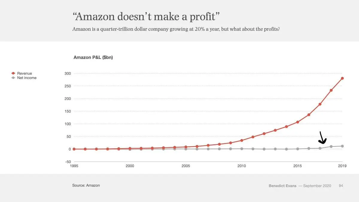Khi Amazon bước vào năm thứ 22, dòng lợi nhuận ròng này mới lần đầu tiên thoát khỏi 0. Trước đó, mỗi năm đều có người viết chuyên mục, chỉ trích, bán khống, nói rằng Amazon là một trò lừa đảo Ponzi sẽ không bao giờ có lời.