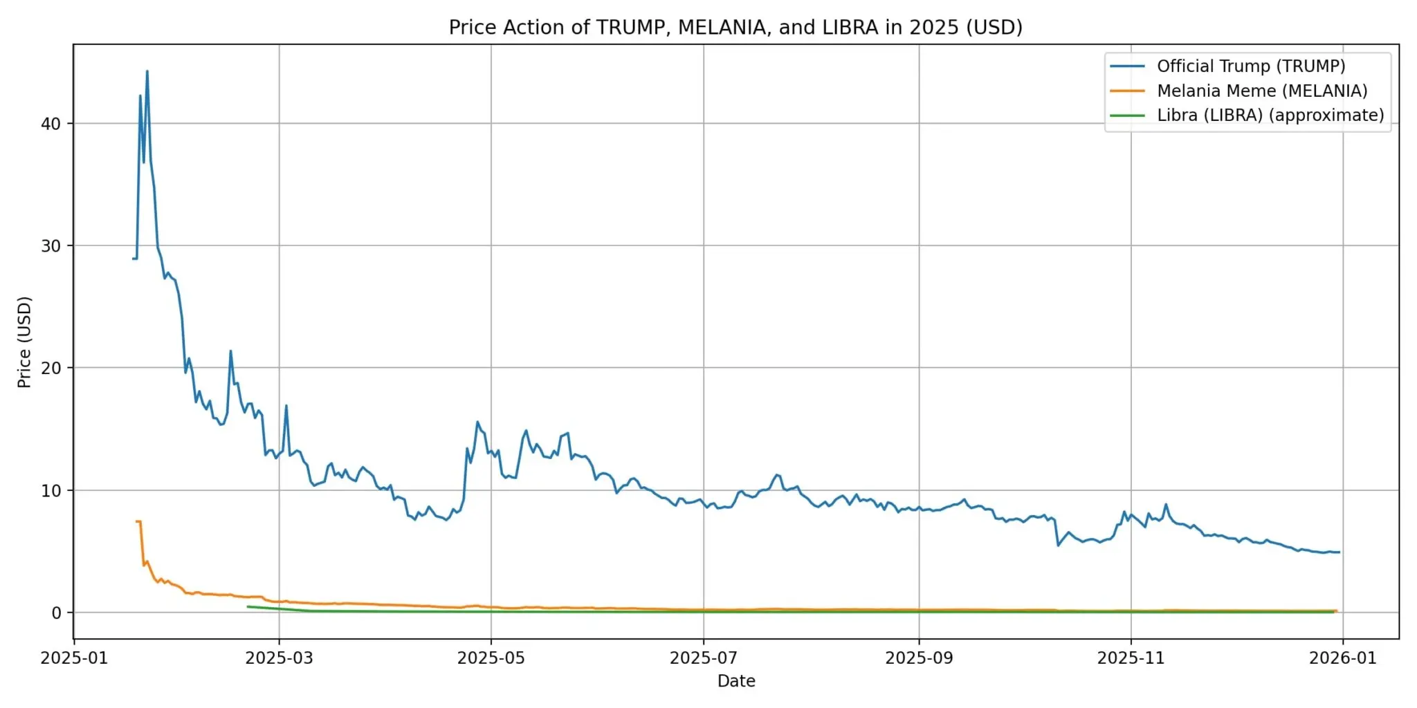Token TRUMP đạt đỉnh gần 45 đô la vào tháng 1 năm 2025 trước khi giảm xuống khoảng 5 đô la, trong khi MELANIA và LIBRA sụp đổ xuống gần bằng không.## Launch Coin → BELIEVE – IPO tốc độ tweet