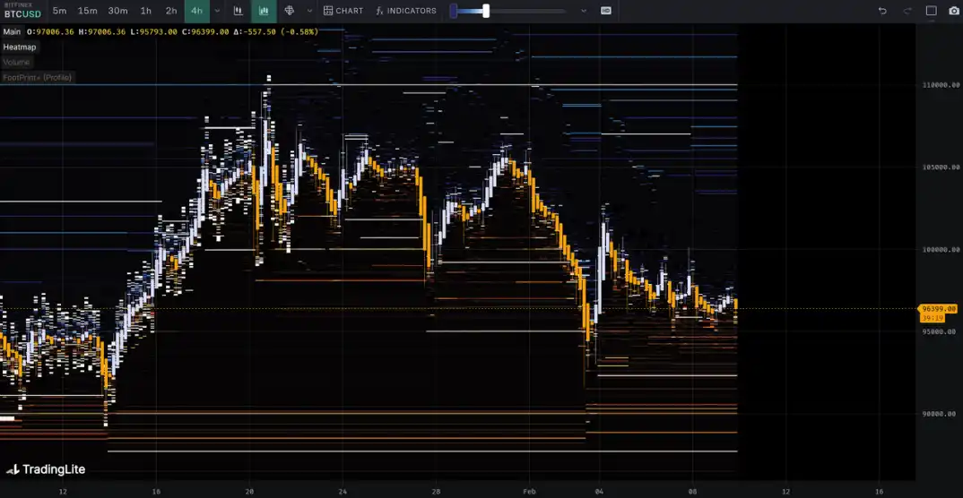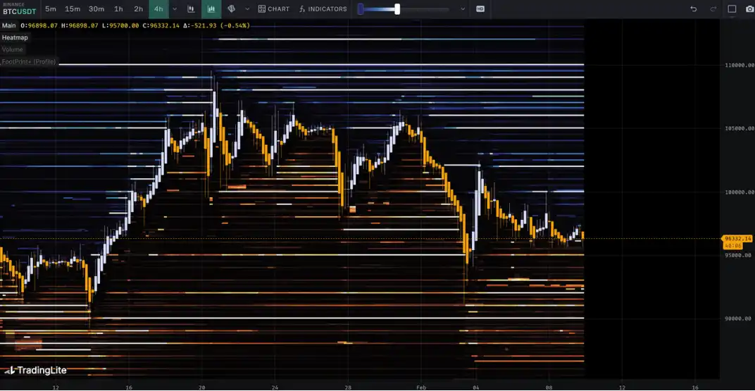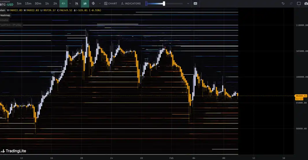 Trong tuần này từ ngày 3 tháng 2 đến ngày 10 tháng 2, giá cam sành cao nhất gần $102500, thấp nhất gần $91231, biến động khoảng 10.99%. Quan sát biểu đồ phân phối chip, có một lượng lớn giao dịch chip xảy ra gần 95000, sẽ có một chút hỗ trợ hoặc áp lực.