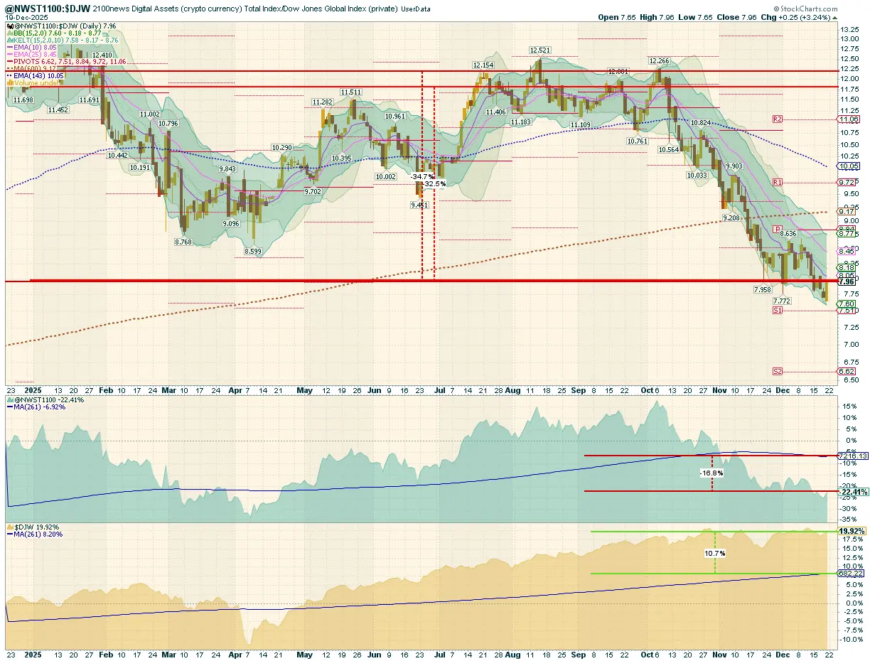 Bốn năm trước: Tài sản số vượt trội rõ rệt so với cổ phiếu toàn cầu trong các thị trường vốn toàn cầu, đạt mức cao kỷ lục trong tỷ lệ so sánh giữa NWST1100 và chỉ số W1Dow.