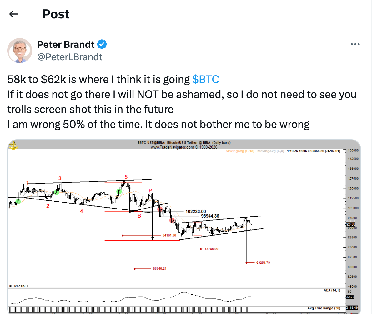 Theo Brandt, phạm vi từ $58,000 đến $62,000 thể hiện mục tiêu giá của ông cho bitcoin trong ngắn hạn, mặc dù ông thừa nhận sự không chắc chắn vốn có trong dự đoán thị trường.