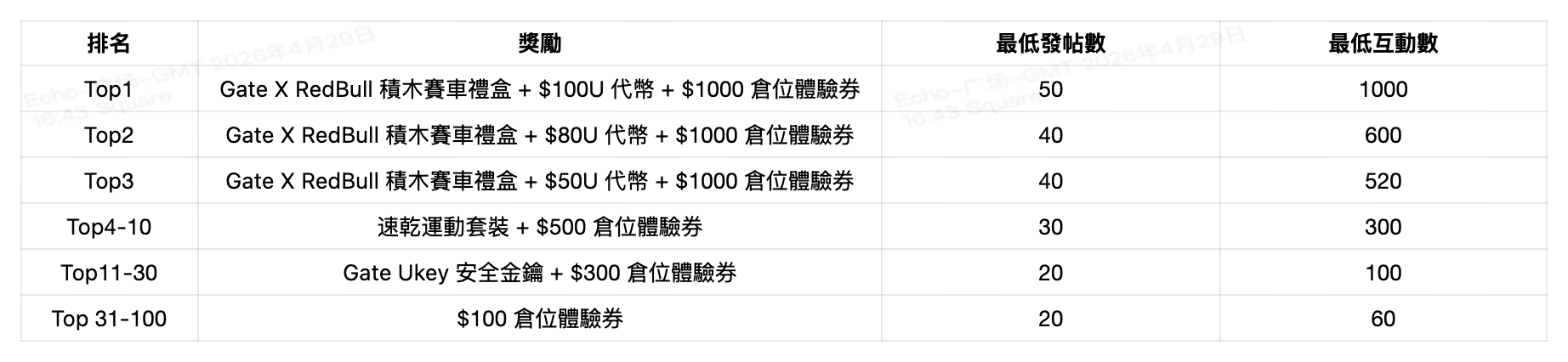 4. 實體週邊獎勵將於活動結束後 14 個工作日內透過電子郵件及站內信通知得獎者。請於收到通知後 30 日內前往 Gate 週邊商城 填寫寄送資訊。逾期未填、資訊錯誤或無人簽收等情況,將視為自動放棄獎勵;寄送資訊提交後無法修改,請務必確認正確無誤。獎勵將於成功提交寄送資訊後 60 日內完成發放。如遇物流异常或奖品缺货等情况,實物獎勵將按以下標準轉換為倉位體驗券發放:Gate X RedBull 積木賽車禮盒:$500 倉位體驗券、速乾運動套裝:$300 倉位體驗券、Gate Ukey 安全金鑰:$100 倉位體驗券。