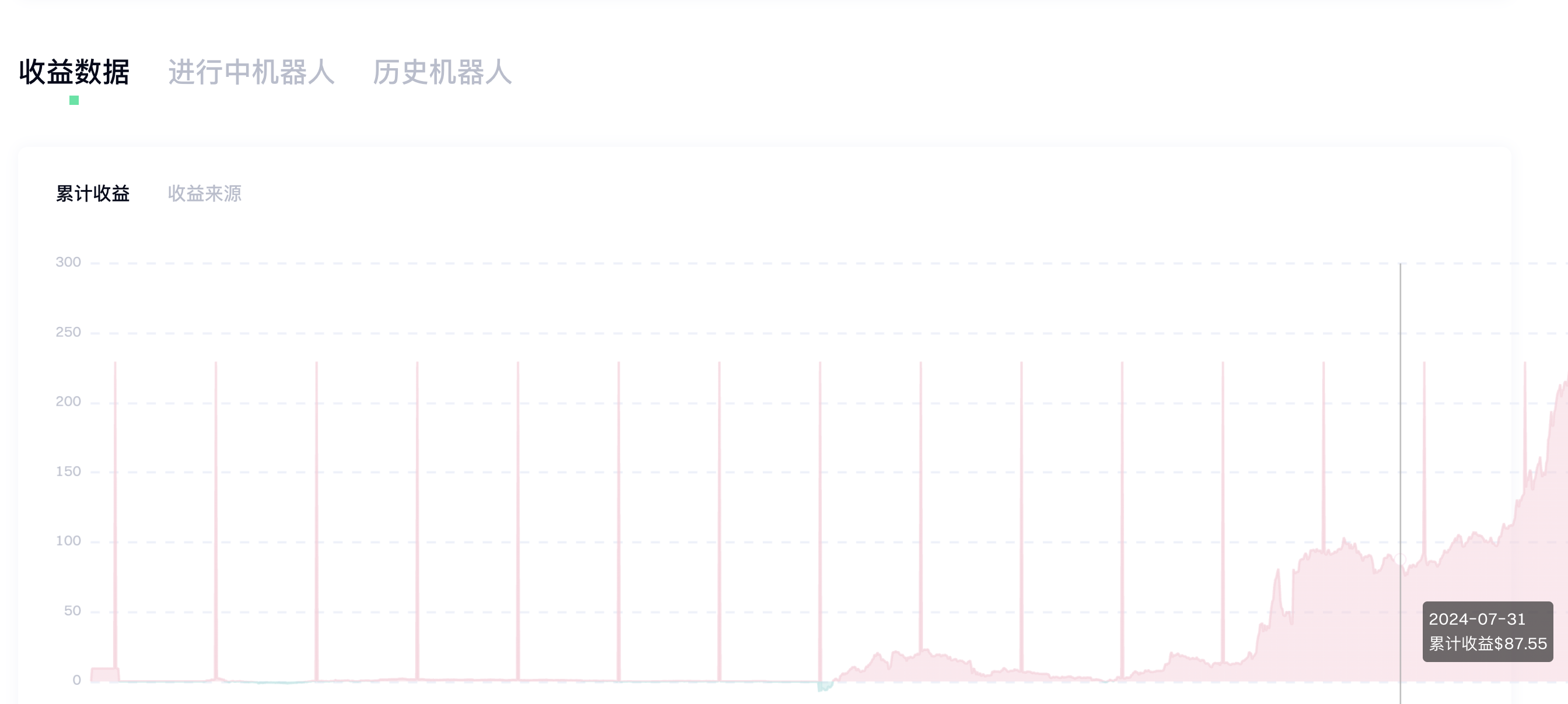 因此,挑選正確的機器人,不只看整體收益情況,還需要分析其近期的收益曲線的走勢,當收益走勢呈現下跌的情況下,建議您謹慎投資。