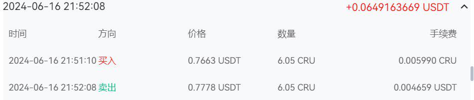 用戶B開了一個價格區間為0.2 - 2.5 USDT的CRU現貨網格機器人,開了200個等差網格,單格買入6.05個CRU。根據網格參數,單格價差應該為0.01155779 USDT,單格收益應該為0.06992463 USDT。但在實際的交易過程中,由於滑點和交易手續費的存在,會出現單格價差小於理論值的情況。
