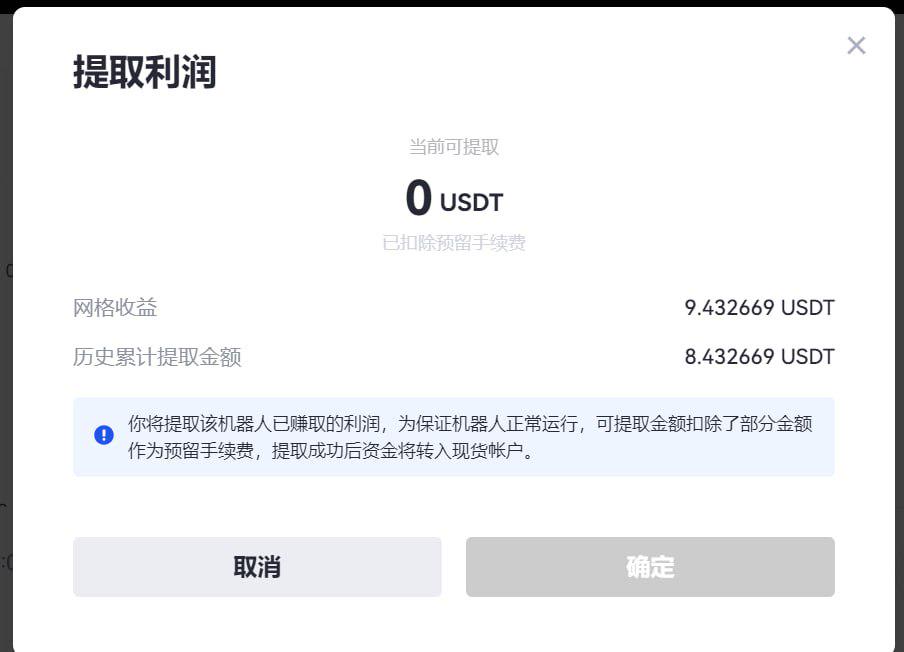 由於目前大部分市場最小下單量為1USDT,所以這裡會保留1USDT 去下單購買base作為手續費抵扣。此時,用戶B將無法按照網格界面顯示的網格收益金額提取網格利潤。