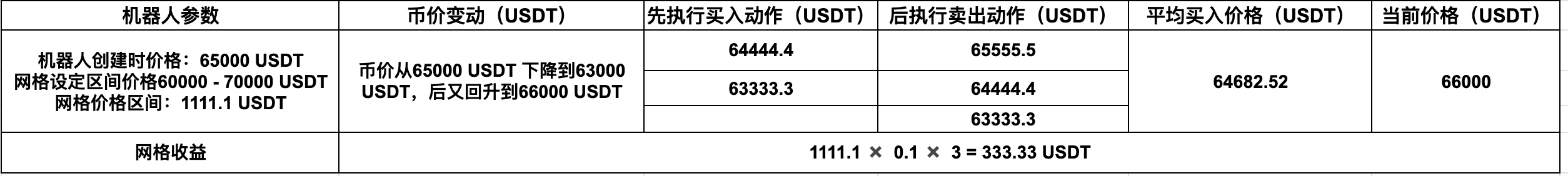 假設用戶C在BTC價格是65,000 USDT時,以65,000 USDT的成交價開了一個價格區間為60,000 - 70,000 USDT的現貨網格機器人,開了10個等差網格,每個網格買入0.1個BTC並在策略開始時刻購買0.5個BTC作為基礎交易BTC。之後幣價下降到63000 USDT,又升到66000 USDT。此時: