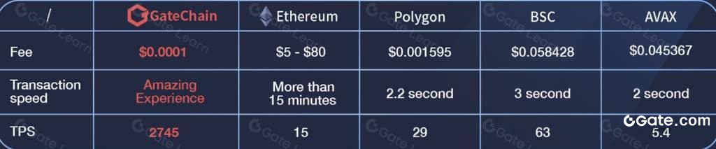 在性能方面,GateChain 出塊時間隔為 4 秒,TPS(每秒交易量,Transaction Per Second)最高可達 2,745,每筆交易的 gas fee 低至 $0.0001。而與之相對,以太坊的 TPS 目前僅為 15 左右,交易確認時間至少需要 12-14 秒。