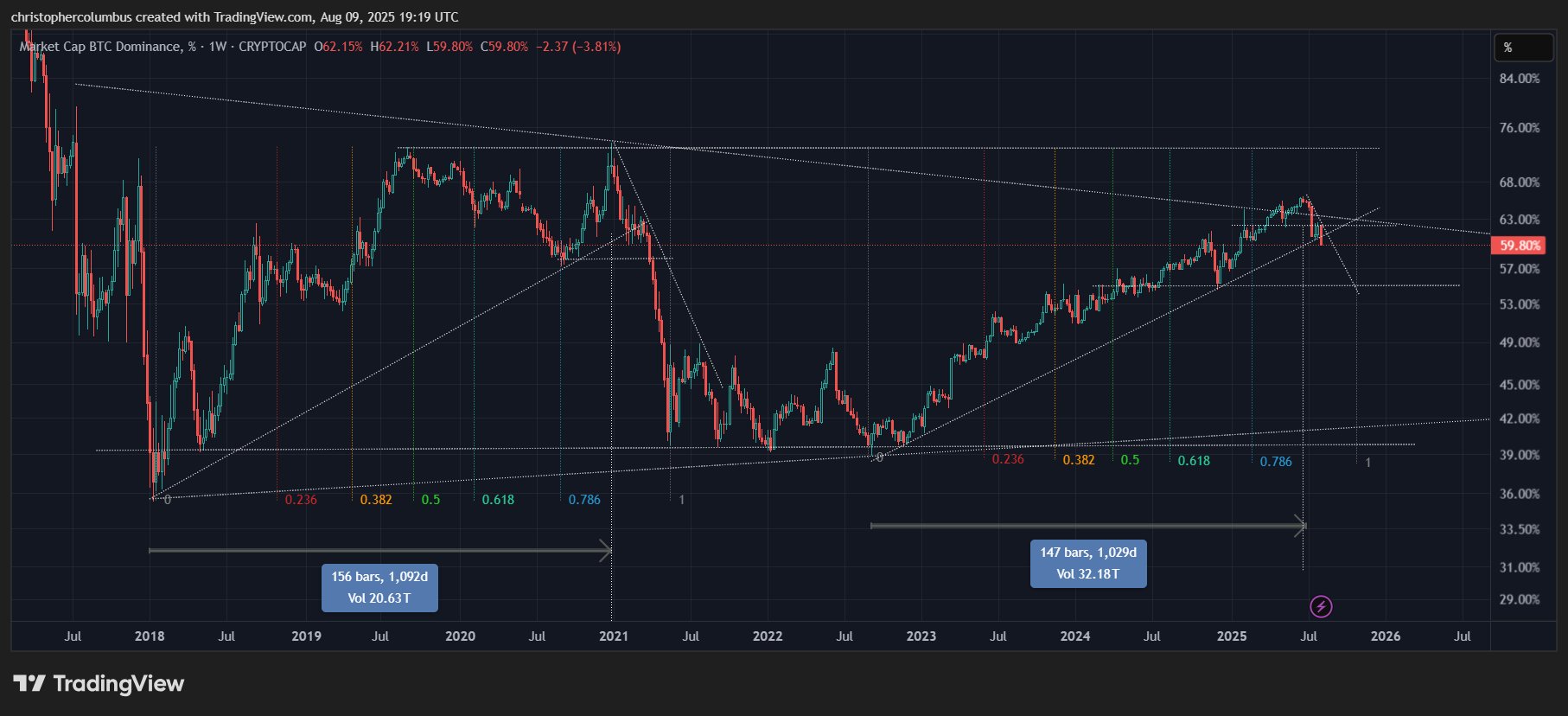 根據Dave the Wave的說法,BTC.D,即比特幣市場總值與整個數字資產市場的比較,常用於衡量山寨幣的強度,已經在60%的水平附近突破了支撐,並且在下一個主要支撐水平54%之前還有一段下跌空間。