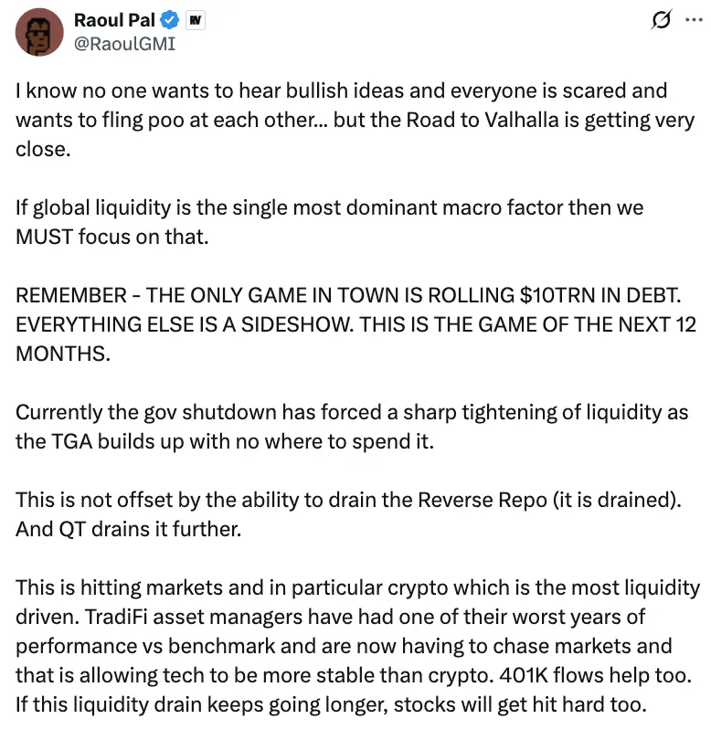 因此 Arthur 認爲,目前加密市場的疲軟只是流動性暫時被財政部鎖住——政府停擺期間,財政部通過發債吸走了美元流動性,但尚未釋放支出。當政府重新開門,這些資金重新流入市場,流動性將再次寬松。與此同時,市場會誤以爲這是頂點,從而拋售比特幣,但那將是一個「重大誤判」。真正的牛市將從「隱形 QE」開始的那一刻重新燃起。