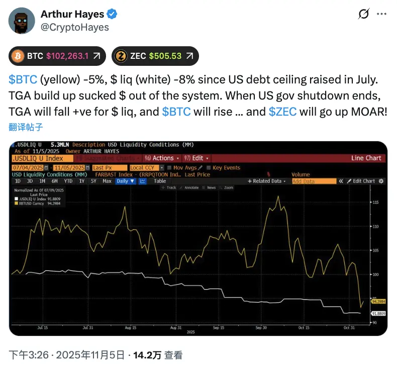 BitMEX 聯合創始人 Arthur Hayes 也呼應了類似的情緒。他將比特幣的下跌與自 7 月以來美元流動性下降 8% 聯繫起來,認爲一旦財政部餘額在停擺後下降,美元流動性將反彈,推動 BTC 走高。