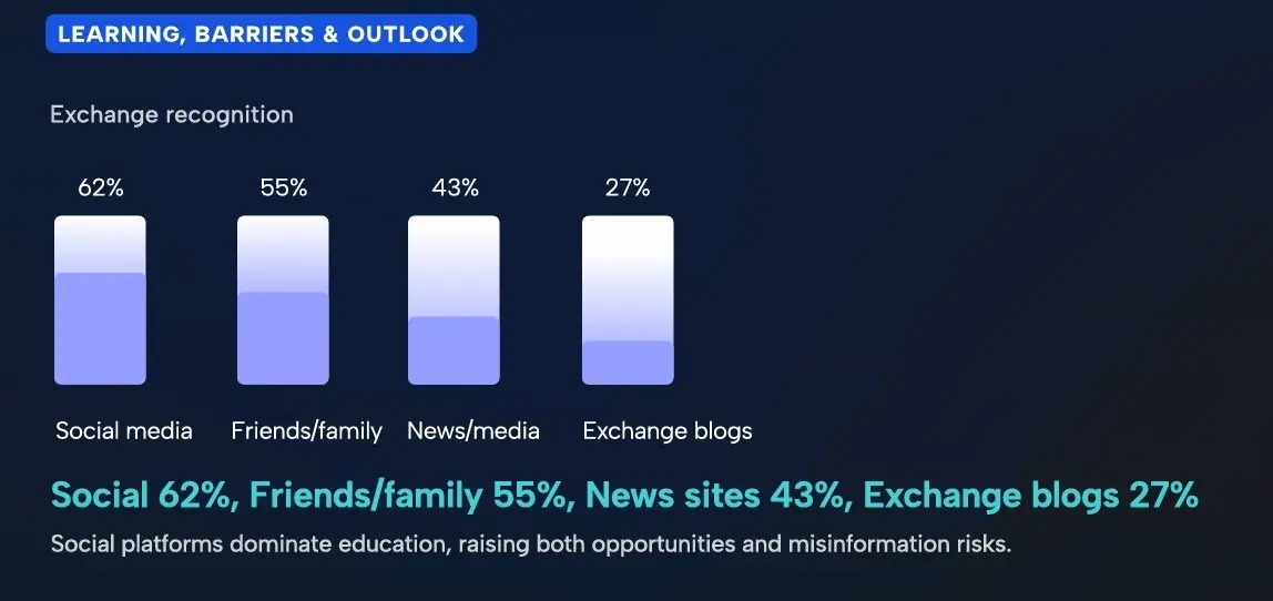 結果顯示,62%的受訪者將社交媒體視爲他們獲取加密教育的主要來源。研究人員指出,這既帶來了機會,也帶來了錯誤信息的風險。