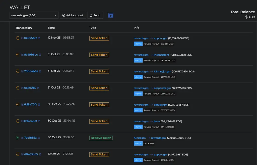 鏈上數據顯示:資金由基金會 eosio.mware 帳戶打入 Greymass 同期新設立的帳戶 uxuiuxuiuxui;隨後,該錢包按月向 http://funds.gm 帳戶轉帳,並備注「Operation + USD/CAD 價格」,形似「工資發放」;再由 http://funds.gm 向 http://rewards.gm 轉帳,最終分發給若幹帳戶如 jesta、inconsistent、http://apporc.gm 等,並注有「Reward Payout+USD 數額」的轉帳記錄;多數受薪帳戶在領取後快速轉入 krakenkraken 帳戶或 Coinbase 等交易所套現。