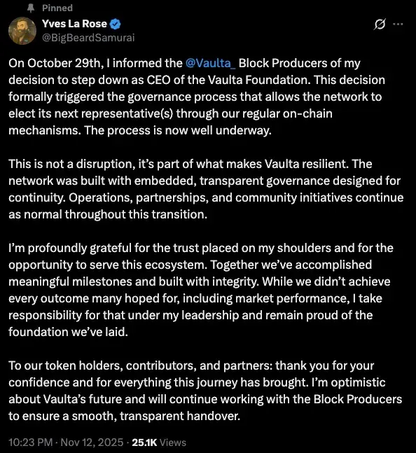 2025 年 11 月 12 日,Vaulta 基金會(原 EOS 網路基金會,下文簡稱 VF)前首席執行官 Yves La Rose 突然在 X 平台發表辭職聲明,稱已於 10 月 29 日通知網路 21 個出塊節點(Block Producers)將主動卸任,並通過鏈上治理選舉新代表。聲明措辭體面,通篇充滿「感恩」和「願景」,但四周後社區驚訝發現——Vaulta 核心的多籤帳戶依然掌握在 Yves 手中,根本沒有交接。