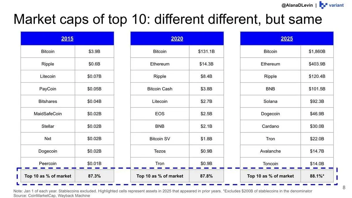 從宏觀角度來看,主要加密資產的規模持續擴大。盡管市場上代幣數量創下新高,但前十大加密資產的價值集中度卻始終保持驚人的穩定。
