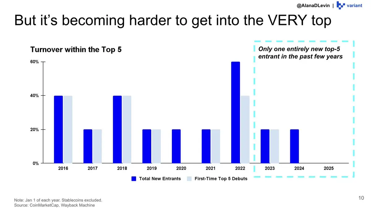 這一趨勢在前五大加密資產中尤爲明顯——過去幾年幾乎沒有新的資產進入這一梯隊。