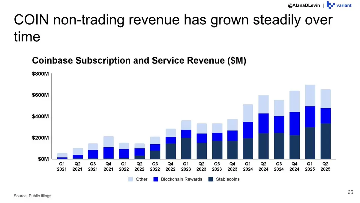交易所是復合型業務。像 @Coinbase 這樣的公司圍繞用戶的二級需求構建了強大的業務線,例如托管服務、質押服務以及收益產品。