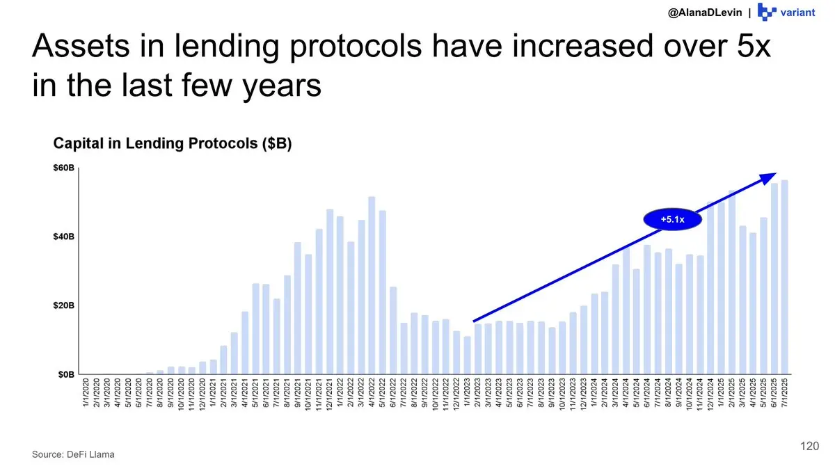 另一個可以觀察到資產利用早期跡象的領域是鏈上借貸。借貸協議中的資產(如 @Morpho)在過去幾年增長了 5 倍以上,並且仍在持續增長!