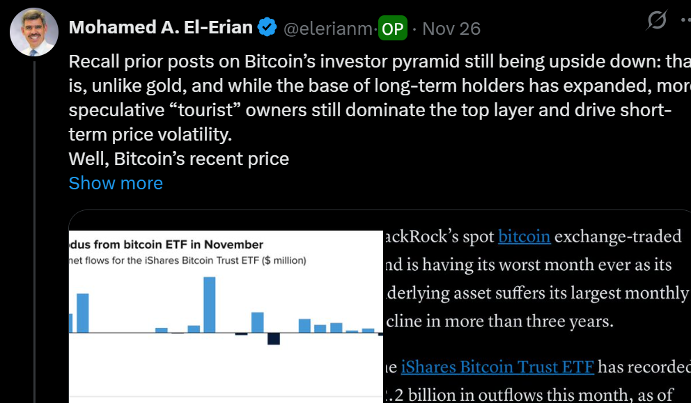 埃裏安在CNBC採訪中表示,"比特幣投資結構仍然是逆金字塔型,盡管長期持有者的比例在增加,但短期投機者仍主導着頂部。"他指出,"最近的下跌是由於這些短期投資者的大規模撤離。"他特別引用了iShares比特幣信托ETF(IBIT)的大規模資金流出作爲依據。