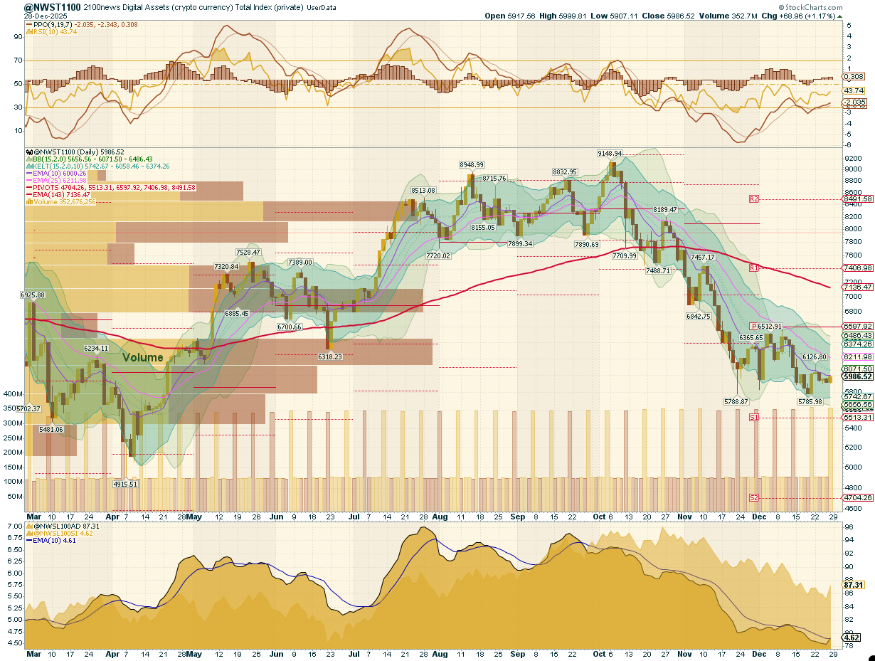 **加密指數 NWST1100 上週漲幅為1.54%。以太坊** **錄得2.61%的跌幅,較過去三十天所有其他區段的損失來得較輕。***\*以下,我們呈現一份標準化的每週報告與下週展望,基於智慧金融的理論Swingtum所準備。我們透過展示2100NEWS數位資產總指數(NWST1100),來衡量市場資本化的1100個重要加密資產的表現,從而判斷加密市場的廣度與方向。這張資訊豐富的圖表初看較為複雜,但它有效呈現關鍵價格資訊、決策層級、動能、交易量與市場廣度。監控**市場情緒與廣度是偵測**趨勢反轉或持續強勢的必要手段。*經過對NWST1100圖表的詳細分析,這個加密貨幣市場的重要指標,揭示了幾個關鍵的市場動態與情緒變化:過去一週,NWST1100指數下跌1.54%,此期間市場持續波動,且以防禦性為主。12月20日短暫突破上行,隨後市場迅速失去中軸支撐,大部分時間在10日EMA下方緩慢下行。日內交易特徵為反覆出現鋒利的V型反彈,隨後又迅速在下午出現賣壓——這是薄弱假日流動性與投資者信心脆弱的明顯跡象。因此,指數仍局限於回歸通道的下半部。直到12月26日,NWST1100才測試中線,暗示可能的聖誕行情,但尚未獲得後續確認。**市場情緒(PPO & RSI)**:動能指標持續反映修正環境。PPO線仍在零以下,顯示盤整而非強烈趨勢,而PPO直方圖在零線上方變平,暗示下行動能放緩。RSI穩定在40低區,表示短期內有緩解,但尚不足以確認趨勢轉變。**加密市場廣度指標:** 廣度指標仍偏弱,儘管早期出現穩定跡象。**Adv-Decline Volume Line (ADVL)**,由2100News為加密市場調整的**ADVPL**,追蹤上漲與下跌數位資產的淨資金流量。它開始上升,但未展現明顯改善。McClellan總和指數,衡量市場廣度的長期版本,仍接近週期低點,但已轉向上升。根據右側圖表,所有**A50R指標**在主要區段(NWST1100, NWSET100, NWSL100, NWSCo100)均已超賣,雖然較極端讀數略有改善。A50R讀數——即資產交易於50日EMA之上的比例——在6%至14%之間持平。以太坊代幣(NWSET100)群組仍是最弱的,只有6%的成分股高於其50日均線。此廣度指標衡量**交易於50日移動平均線之上的數位資產百分比**。*\*交易於特定移動平均線之上的數位資產百分比,是衡量內部強弱的廣度指標。右側圖表比較以下幾個群組中,交易於50日EMA之上的比例:*1. *NWSL100的100個大型股(頂部區塊)*2. *NWST1100的1100個成分股*3. *NWSET100的100個以太坊代幣(*4. *NWSCo100的100個幣)底部區塊(*📉 **摘要**總結來說,儘管週中偶有反彈與週末季節性小幅提振,加密貨幣市場仍處於修正階段。這一週強化了防禦性交易環境,特徵為均值回歸而非趨勢追隨。動能已穩定,但未有實質性增強,廣度仍深度超賣,領導地位集中於少數藍籌資產。整體而言,市場尚未進入確定的復甦階段。)# **本週展望**本報告分析加密市場短期展望,識別可能提供市場方向線索的模式與信號。雖然預測市場行為本身具有不確定性,但動能與市場廣度指標的明顯趨勢暗示可能的發展。1. 本週展望指向形成圓底形態。季節性——近期聖誕期間提供穩定作用而非成長動能。季節性需求幫助市場守住關鍵支撐,但未能產生持續的上行動能。價格走勢顯示,假日相關資金流較像是*暫時的緩衝*,抵禦進一步下跌,而非新一波上漲的催化劑。2. RSI###相對強弱指數(上週為43,可能上升,暗示下行壓力正在減弱。3. PPO直方圖,衡量PPO線變化率)即第一導數(,可能攀升。隨著直方圖上升,代表動能逐步回升。PPO線仍深度負值,但在紅色區域內向零線靠攏,這一模式暗示下行動能放緩,儘管PPO線可能仍會保持在零以下。4. 第一張圖底部的廣度指標)NWST1100(:ADVPL可能率先出現資金流入上升的跡象,McClellan總和指數也可能持續在目前水平附近上升。5. 季節性仍是雙刃劍。聖誕相關需求幫助避免更深的崩盤,但這種支撐是暫時的。隨著市場進入一月,季節性動能逐漸消退,缺乏基本需求與正向動能,增加了再次下行的風險。目前尚缺乏新資金進入市場的明顯跡象,且在目前條件下,新年開始並未展現出積極的加速跡象。📌 **目標與情境考量:****最可能的情境**:NWST1100在10日DEMA與25日EMA之間震盪,反映一個脆弱的穩定階段,而非確定的底部。這與PPO直方圖逐步改善的趨勢一致,可能產生局部較高的低點,但尚未獲得更廣泛的確認。控制性地向Pivot P)~6,100(緩慢移動,仍有可能,前提是季節性支撐持續。然而,一旦假日需求消退,市場變得越來越脆弱。若無法吸引新資金,可能在一月初再次測試較低支撐區,保持整體修正結構。整體而言,市場正從投降轉向穩定,但尚未進入復甦階段。情緒仍脆弱,若缺乏廣度或動能的明顯擴展,僅靠穩定可能不足以阻止季節性效應消退後的進一步壓力。📍 **關鍵支撐位:*** 支撐:5800 )Keltner下界(* 阻力:6100-6200 )Pivot P、25日EMA(![])https://img-cdn.gateio.im/social/moments-c71ad89cf1b91d7582332e495d40f866( )# **不同數位資產群組的表現 ###Coins與Tokens(**![])https://img-cdn.gateio.im/social/moments-6ca926a11a10ba210bf916d1febdbe68(投資者與交易者依賴歷史績效資料來分析短期變動與評估不同市場區段的相對強度。最新表格顯示,所有類別皆呈下行趨勢,NWST1100指數過去一週下跌1.54%。![])https://img-cdn.gateio.im/social/moments-8af134b6b7783e880d3214411005062c(上方圖表突顯多種加密貨幣的表現,包括比特幣、以太坊,以及代表以太坊代幣的2100NEWS指數)NWSET100(、大型股)NWSL100(與幣)NWSCo100(。其中,以太坊在過去30天表現最強,跌幅較小,僅為-2.61%