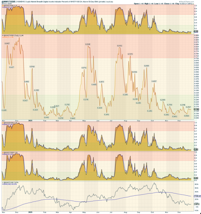 根據右側圖表,所有A50R指標在主要區段(NWST1100, NWSET100, NWSL100, NWSCo100)均已超賣,雖然較極端讀數略有改善。A50R讀數——即資產交易於50日EMA之上的比例——在6%至14%之間持平。以太坊代幣(NWSET100)群組仍是最弱的,只有6%的成分股高於其50日均線。