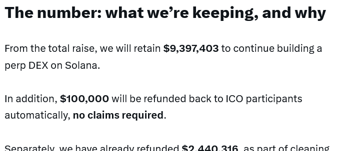 Trove 在星期一表示:「從總籌集資金中,我們將保留 9,397,403 美元,用於在 Solana 上繼續建設永續交易所(perp DEX)」,並解釋說這是「唯一能讓 Trove 活下來的真正產品之路」。