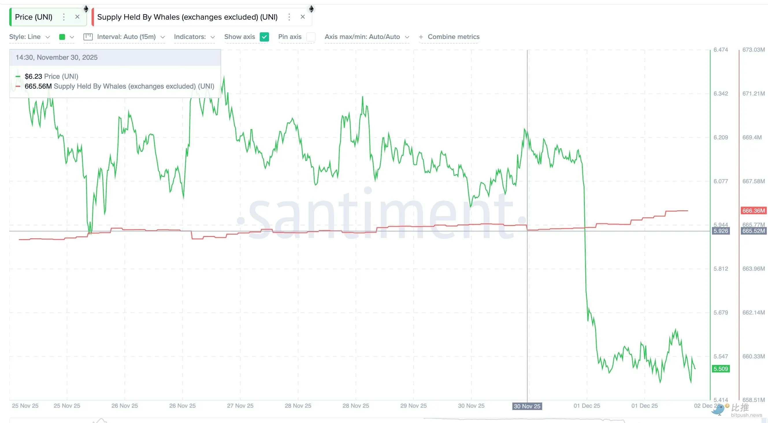 UNI: 过去一周巨鲸新增约80万枚(价值近$500万美金),费用开关投票通过后,排名前 100 的地址共持有 898 万枚 UNI,显示出强劲的吸筹势头,而交易所的供应量却在持续减少。
