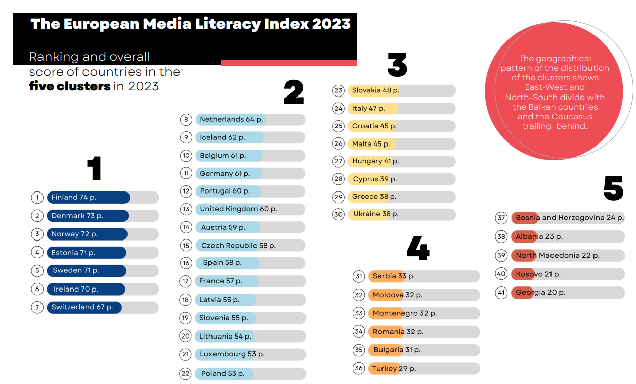 根據保加利亞開放社會研究所(Open Society Institute)編制的「歐洲媒體識讀指數」,芬蘭在 2017 年至 2023 年間,持續保持在歐洲排名第一的寶座。