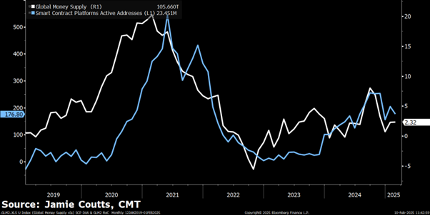 !Image来源:Jamie Coutts/XCoutts 分享了一张图表,表明活跃的加密地址遵循 M2 的趋势。